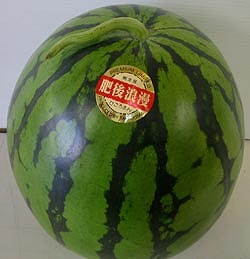 特徴糖度の特に高いラグビーボール型小玉スイカ.果長20cm、果重2kg内外、鮮明な細縞をつけた楕円形小玉種で、変形や空洞果になりにくい。皮目が薄く、果肉は濃紅桃色と濃い黄色とあります。